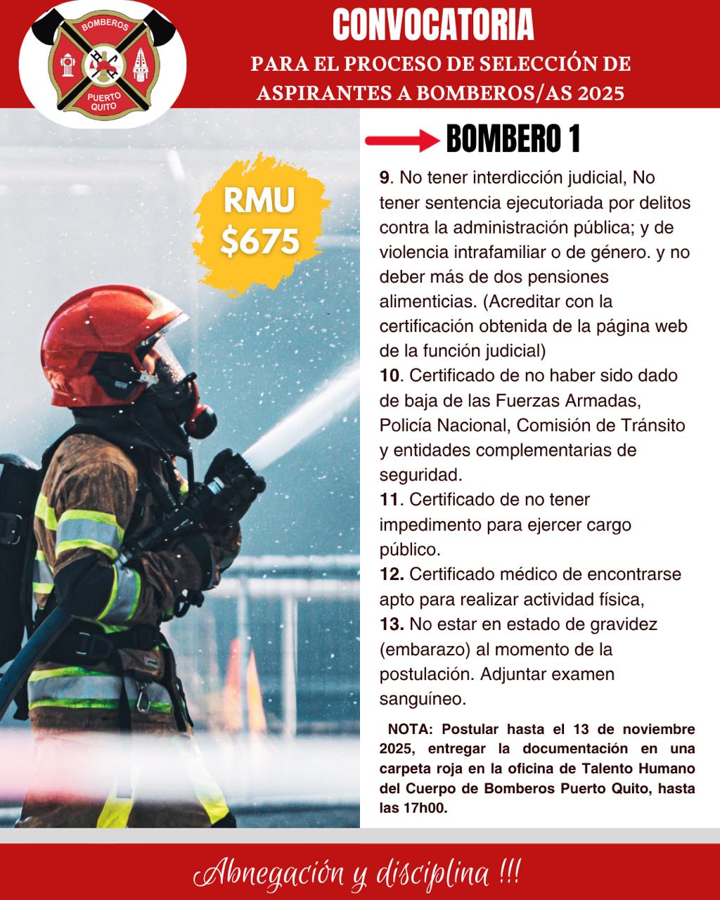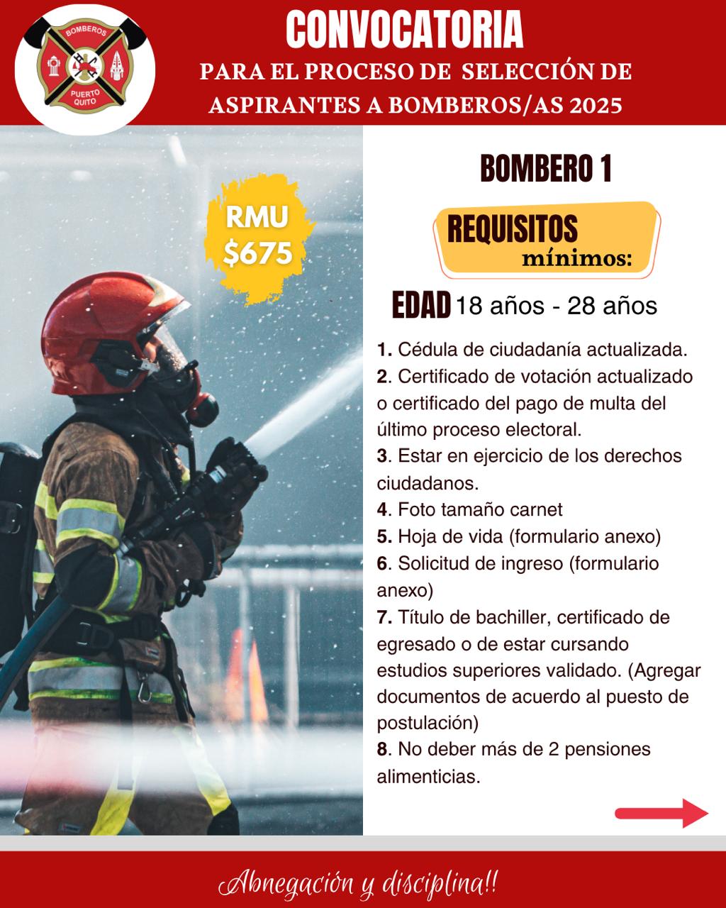 En concordancia con lo establecido en la Norma Técnica Institucional para el Reclutamiento y Selección de Bomberos de Puerto Quito, Artículos 1-5, Resolución No. SNGR-017-2023 del Servicio Nacional de Gestión de Riesgos y Emergencias y demás normativa vigente, contando con la documentación necesaria dentro de la etapa preparatoria y una vez que se encuentra conformado el Tribunal de Merito y Oposición del Cuerpo de Bomberos de Puerto Quito, se procede a dar inicio al concurso abierto, de méritos y oposición para ingreso a la carrera bomberil, correspondiente al Cuerpo de Bomberos de Puerto Quito, grado de Bombero 1.