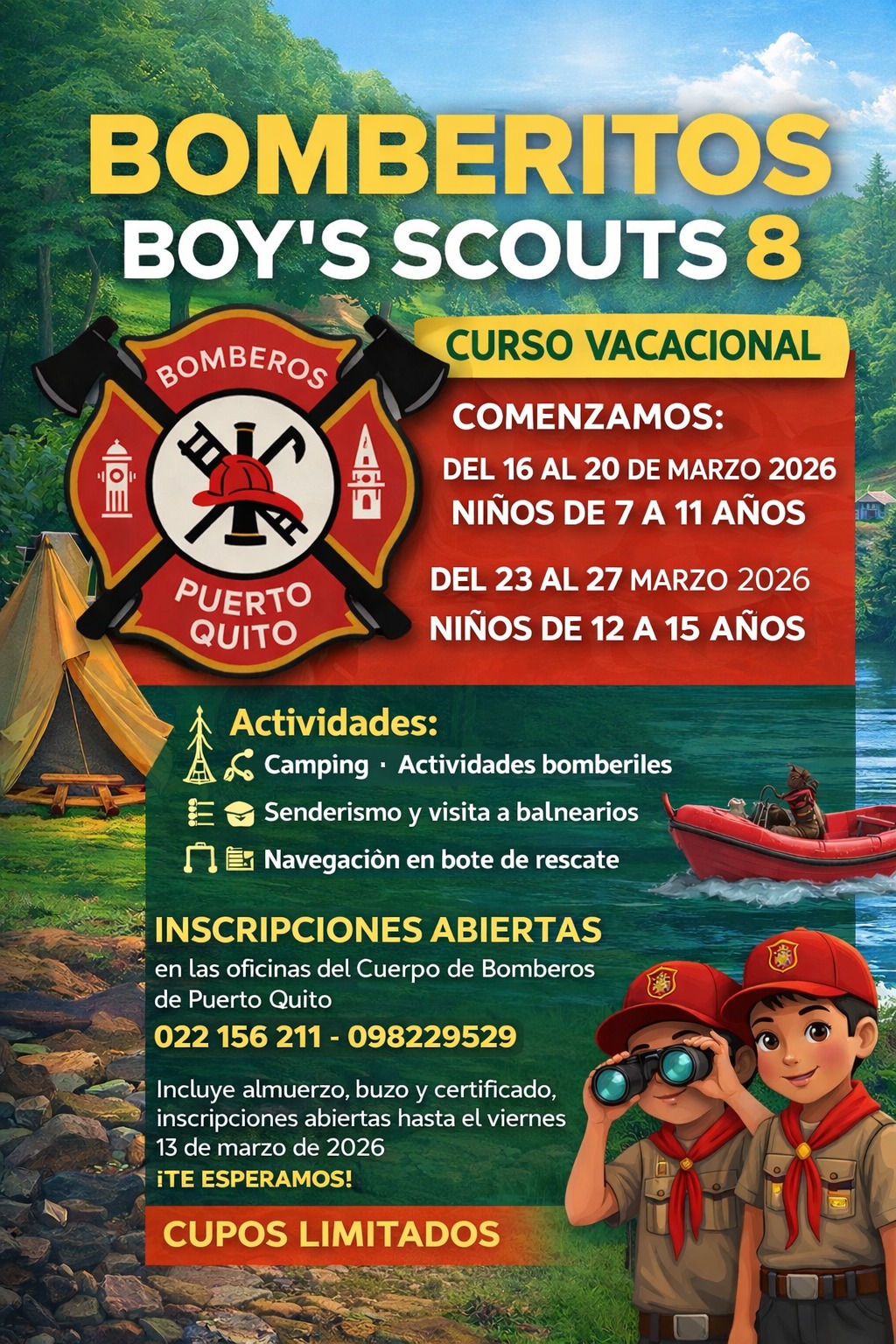 🔥🚒 ¡Llega el Curso Vacacional «Bomberitos Boy’s Scouts 8»! 👨🚒🌿 El Cuerpo de Bomberos de Puerto Quito..